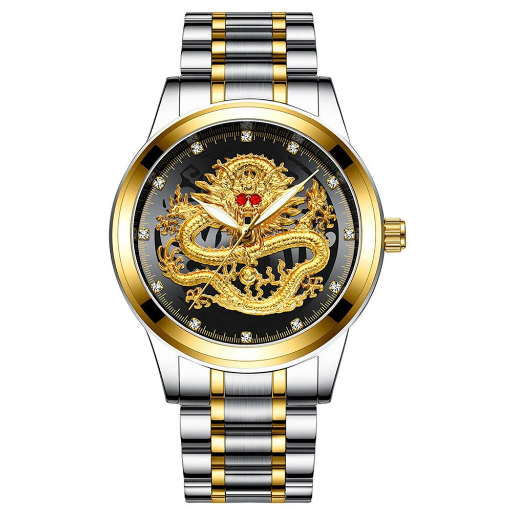 3D Embossed Dragon Dial: Crafted with a stunning, high-relief gold dragon motif designed to catch the light, providing a majestic visual presence on the wrist.