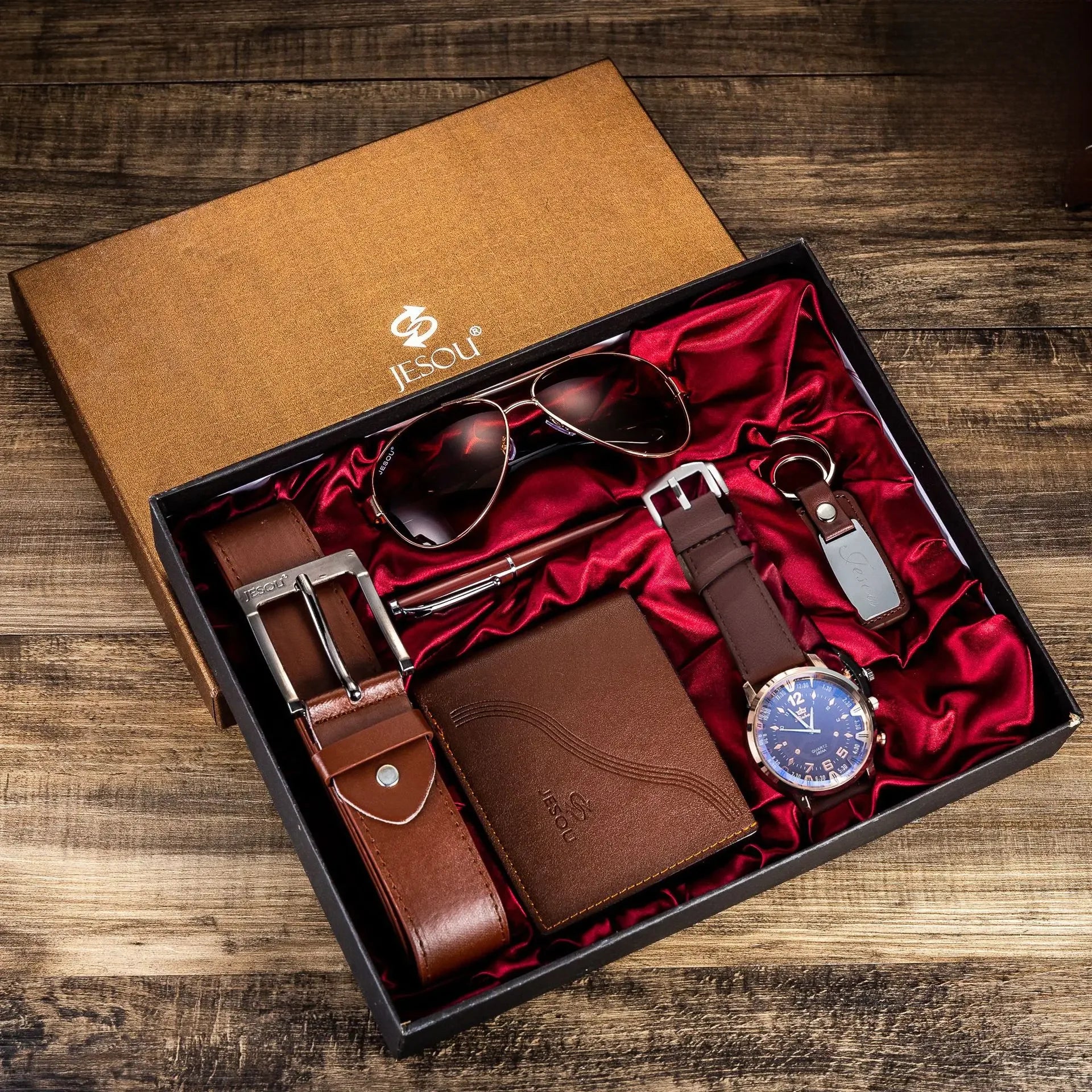 This Jesou boutique set is built for partners who want a fully coordinated look without the hassle of hunting down matching individual accessories. We’ve cut the flowery robot-speak to focus on the 6-piece collection featuring a large-dial watch, bifold wallet, aviator sunglasses, smooth leather belt, ballpoint pen, and a matching keychain. It is a solid, leather-focused kit presented in a red satin-lined gift box, providing a sharp, matching keepsake for partners worldwide.